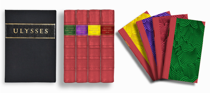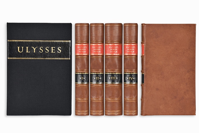 Leather Bound Editions are presented in an elegant fitted box with a gold tooled leather spine label. We’ve adapted our signature clamshell box to house 4 volume sets of Ulysses.
